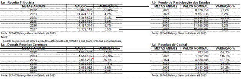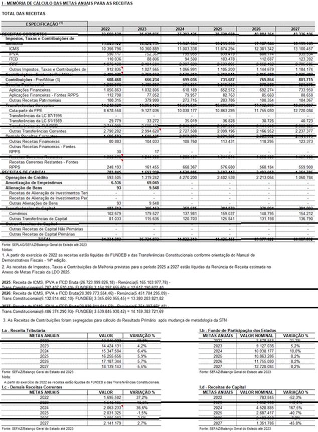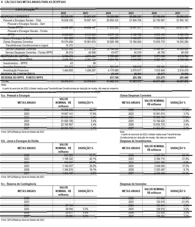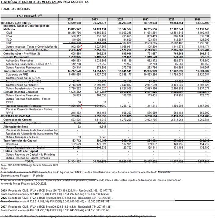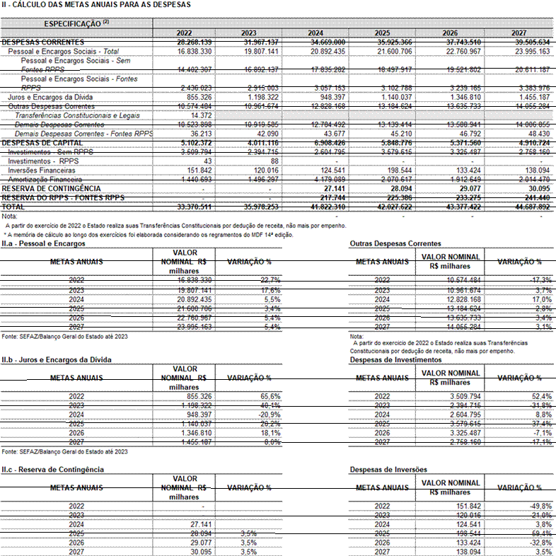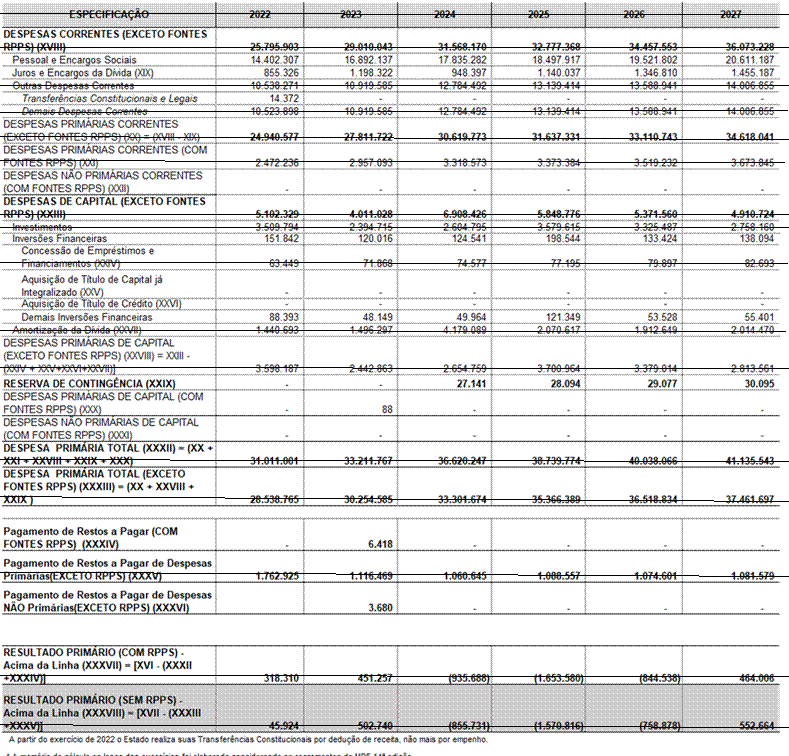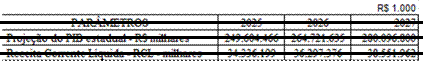 Ressalta-se que o cenário macroeconômico desenhado para os próximos anos destaca crescimento, tanto nacional quanto local, passado o período de restrições decorrentes do coronavírus. As previsões até 2027 indicam crescimento gradual que impactarão de forma direta nas perspectivas de arrecadação do tesouro estadual. Assim, as despesas foram organizadas contemplando essas perspectivas ao longo do período 2025 – 2027.