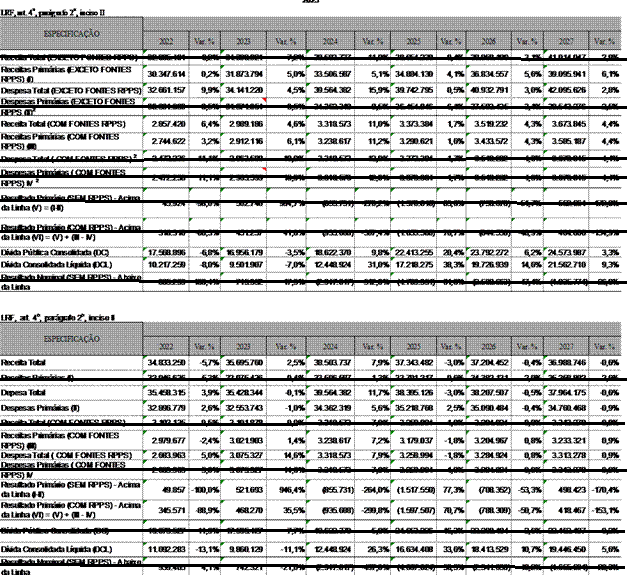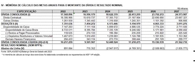 - Demonstrativo elaborado: (i) com base no Manual de Demonstrativos Fiscais: aplicado à União e aos Estados, ao Distrito Federal e aos Municípios /ao Ministério da Fazenda, à Secretaria do Tesouro Nacional. – 14.ª ed., válido a partir do exercício financeiro de 2024 (Portaria STN/MF n.º 699, de 7 de julho de 2023); e (ii) em atenção ao Ofício n.º 001549/2024/SEPLAG/SEXEC-PLO, de 23 de fevereiro de 2024.