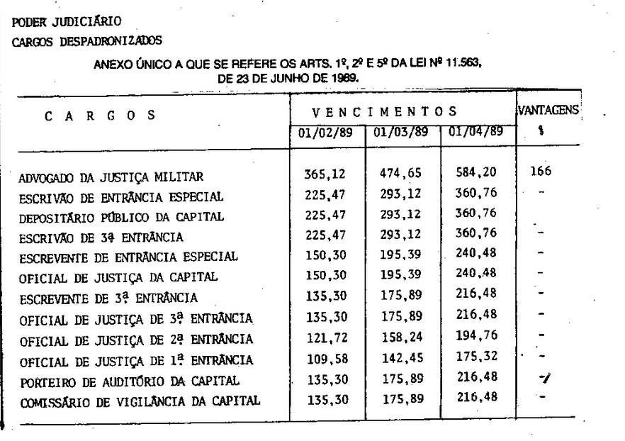 Art. 1º - Os vencimentos dos cargos de Advogado da Justiça Militar, Escrivães, Oficiais de Justiça, Escreventes, Depositário Público, Porteiros de Auditórios e Comissários de Vigilância são os constantes do Anexo Único desta Lei.