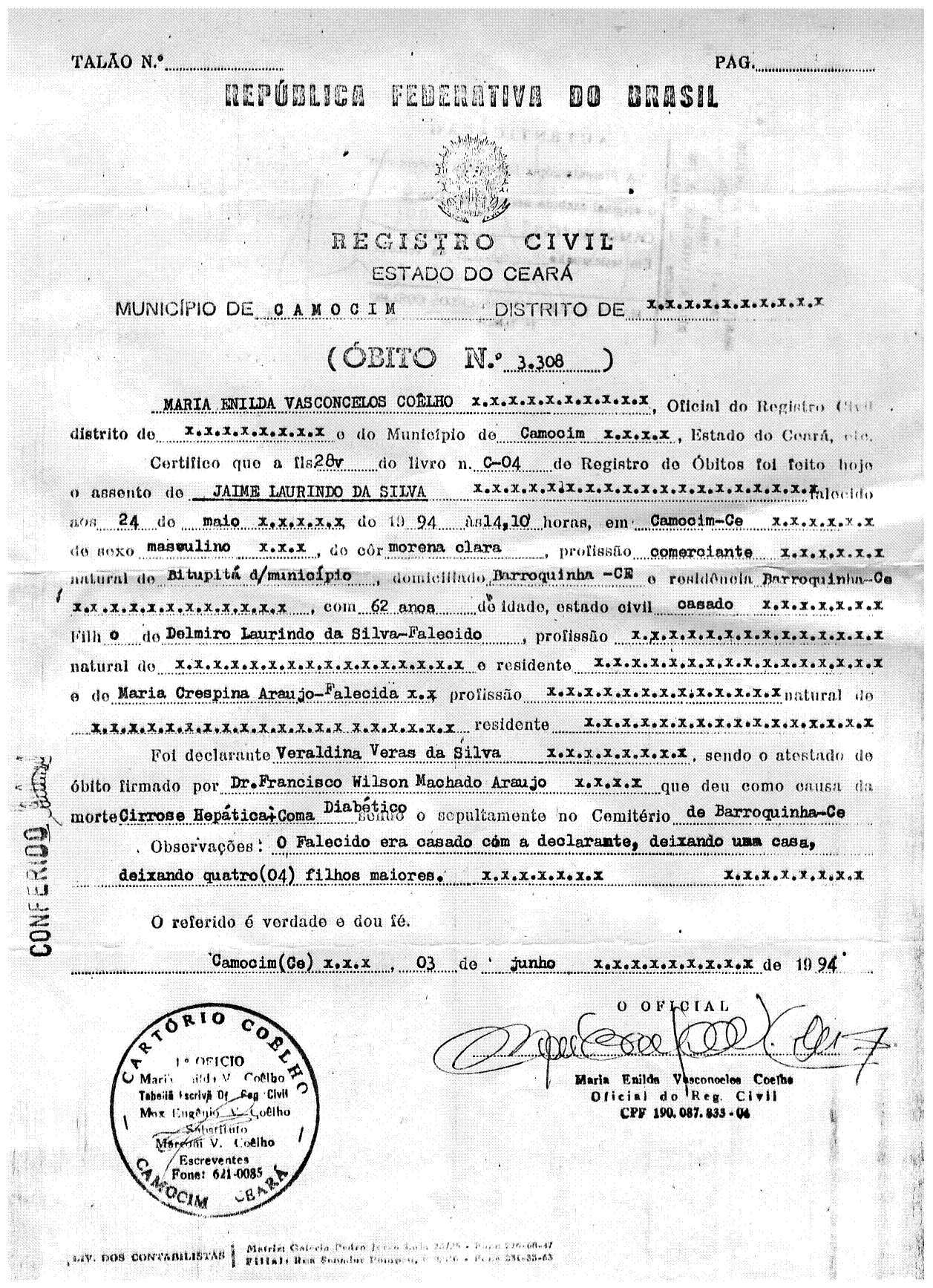 Jaime Laurindo da Silva nasceu em 06 de janeiro de 1932 no distrito de Bitupitá, localizado atualmente no Município de Barroquinha - CE. Filho de Delmiro Laurindo da Silveira e Maria Crispina de Araújo.