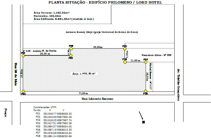 Terreno de formato irregular, denominado Ed. Philomeno – Lord Hotel, com frente para a Rua Liberato Barroso, lado ímpar, fazendo esquina com a Rua Vinte e Quatro de Maio, Centro, município de Fortaleza, Estado do Ceará.