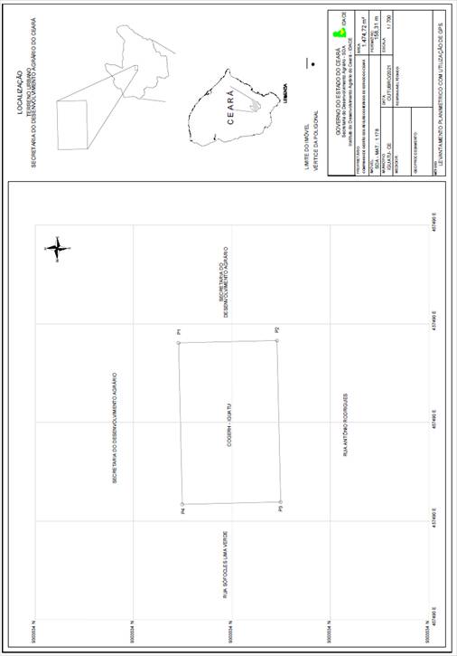 Inicia-se a descrição deste perímetro no vértice P1, de coordenadas N 9295377.66 e E 466031.21, situado no limite com o(a) SECRETARIA DO DESENVOLVIMENTO AGRÁRIO, segue com distância (m) 30.00 e azimute 178°40'00"; e chega no vértice P2, de coordenadas N 9295347.67 e E 466031.91, situado no limite com o(a) RUA ANTÔNIO RODRIGUES, segue com distância (m) 49.16 e azimute 268°40'00"; e chega no vértice P3, de coordenadas N 9295346.53 e E 465982.77, situado no limite com o(a) RUA SÓFOCLES LIMA VERDE, segue com distância (m) 30.00 e azimute 358°40'00"; e chega no vértice P4, de coordenadas N 9295376.52 e E 465982.07, situado no limite com o(a) SECRETARIA DO DESENVOLVIMENTO AGRÁRIO, segue com distância (m) 49.16 e azimute 88°40'00"; e chega ao ponto inicial da descrição deste perímetro. Todas as coordenadas aqui descritas estão georreferenciadas ao Sistema Geodésico Brasileiro, e encontram-se representadas no Sistema UTM, referenciadas ao meridiano central – 39º, tendo como Datum o SIRGAS 2000. Todos os azimutes e distâncias, área e perímetro foram calculados no plano de projeção UTM.
